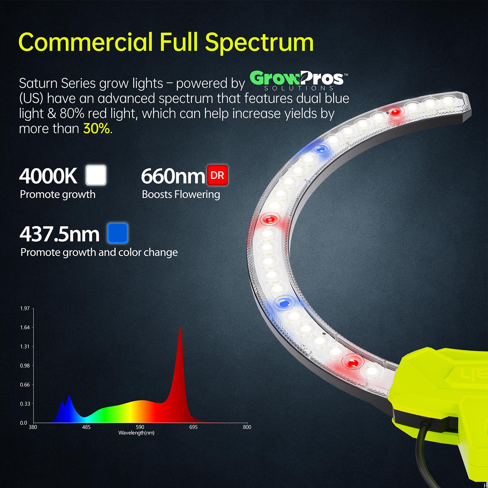 Proven Commercial Full Spectrum: Grow Pros Solutions from the USA validates the Saturn series' full-spectrum light. Specifically, it combines 4000K white, 437.5nm blue, and 660nm red light to create sunlight-like conditions. As a result, this under canopy LED grow light promotes robust growth during both vegetative and flowering stages.