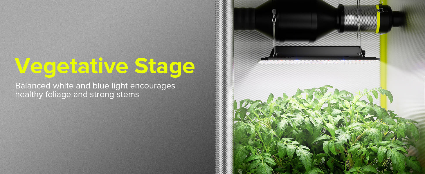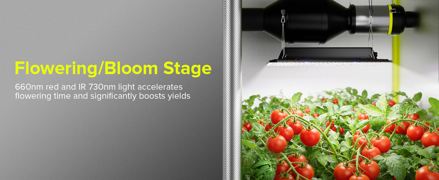 It features a sunlike full spectrum lighting, including 6200K White, 437nm Blue, 660nm Deep Red, and 730nm IR. This commercial-grade spectrum is optimized for all growth stages of plants.